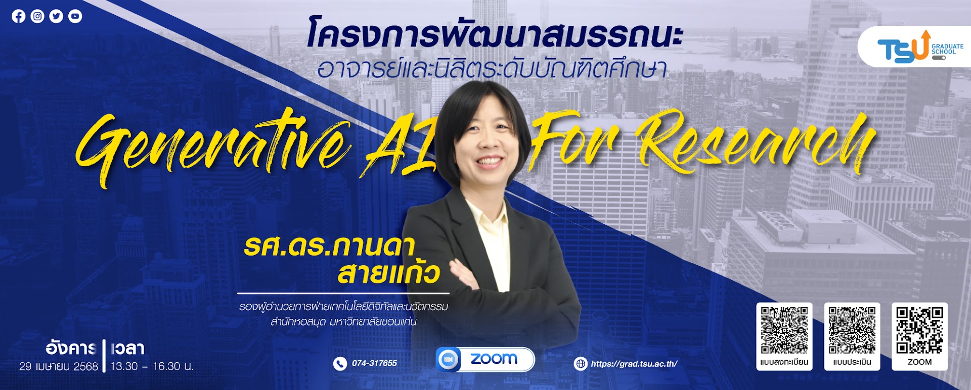 รศ.ดร.กานดา สายแก้ว รองผู้อำนวยการฝ่ายเทคโนโลยีดิจิทัลและนวัตกรรม สำนักหอสมุด มหาวิทยาลัยขอนแก่น ได้รับเกียรติเชิญให้เป็นวิทยากรจากมหาวิทยาลัยทักษิณซึ่งจัดการอบรมเชิงปฏิบัติการ “Generative AI For Research” ให้แก่อาจารย์และนิสิตระดับบัณฑิตศึกษา มหาวิทยาลัยทักษิณ โดยการอบรมดังกล่าวจัดขึ้นในวันอังคารที่ 29 เมษายน 2568 เวลา 13.30 – 16.30 น. ผ่านระบบ Zoom ซึ่งเป็นส่วนหนึ่งของโครงการพัฒนาสมรรถนะอาจารย์และนิสิตระดับบัณฑิตศึกษา โดยมีวัตถุประสงค์เพื่อให้ผู้เข้าอบรมสามารถประยุกต์ใช้ Generative AI ในการทำวิจัยได้อย่างมีประสิทธิภาพ