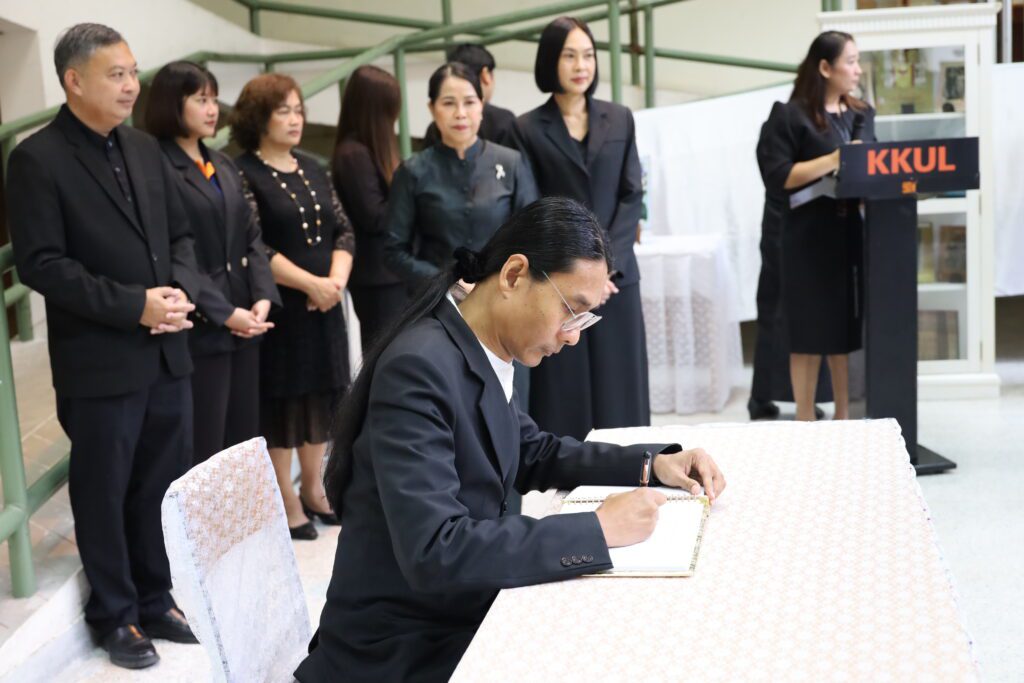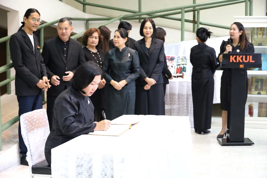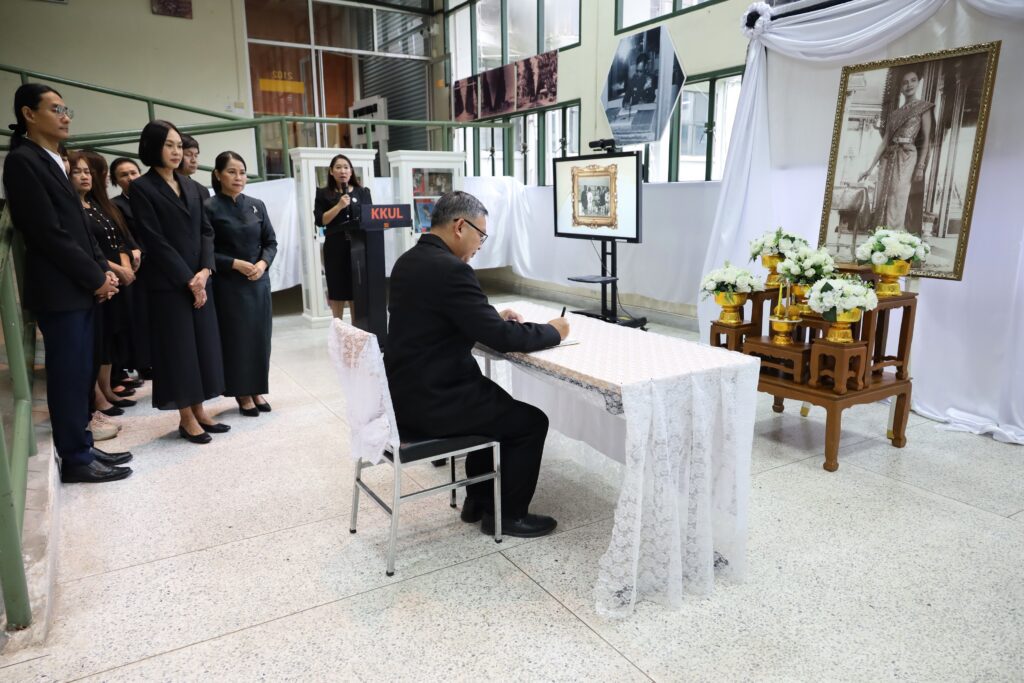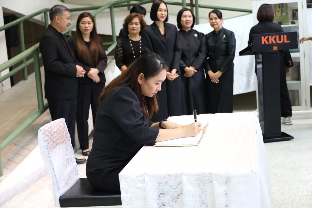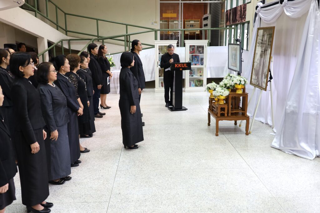 วันศุกร์ที่ 31 ตุลาคม 2568 เวลา 11.39 น. ณ หอจดหมายเหตุ สำนักหอสมุด มหาวิทยาลัยขอนแก่น ผู้บริหาร และ บุคลากรจากทุกหน่วยงานของ สำนักหอสมุด มข. ได้น้อมเกล้าน้อมกระหม่อมประกอบพิธีถวายความอาลัยแด่ สมเด็จพระนางเจ้าสิริกิติ์ พระบรมราชินีนาถ พระบรมราชชนนีพันปีหลวง โดยมี รศ.นพ.สุพัชญ์ สีนะวัฒน์ ผู้อำนวยการสำนักหอสมุด ประธานในพิธี นำกล่าวคำถวายความอาลัย หน้าพระฉายาลักษณ์ พร้อมด้วยผู้บริหาร และบุคคลากรเข้าร่วมพิธี และ ลงนามถวายความอาลัยและน้อมรำลึกในพระมหากรุณาธิคุณ ที่ทรงปฏิบัติพระราชกรณียกิจนานัปการ เพื่อประโยชน์สุขของพสกนิกรชาวไทย อีกทั้งทรงพระราชทานพระเมตตาเสด็จประกอบพระราชกรณียกิจอันเกี่ยวเนื่องกับมหาวิทยาลัยขอนแก่น เป็นระยะเวลายาวนานหลายทศวรรษ นับเป็นพระมหากรุณาธิคุณล้นเกล้าล้นกระหม่อมอย่างหาที่สุดมิได้