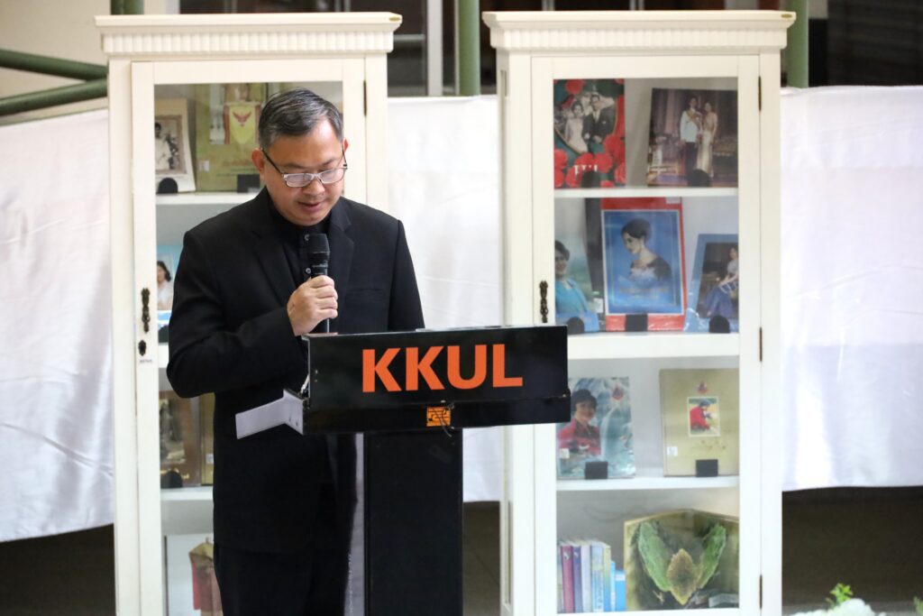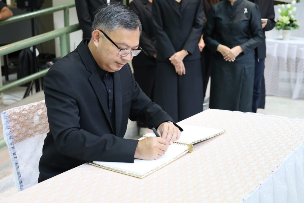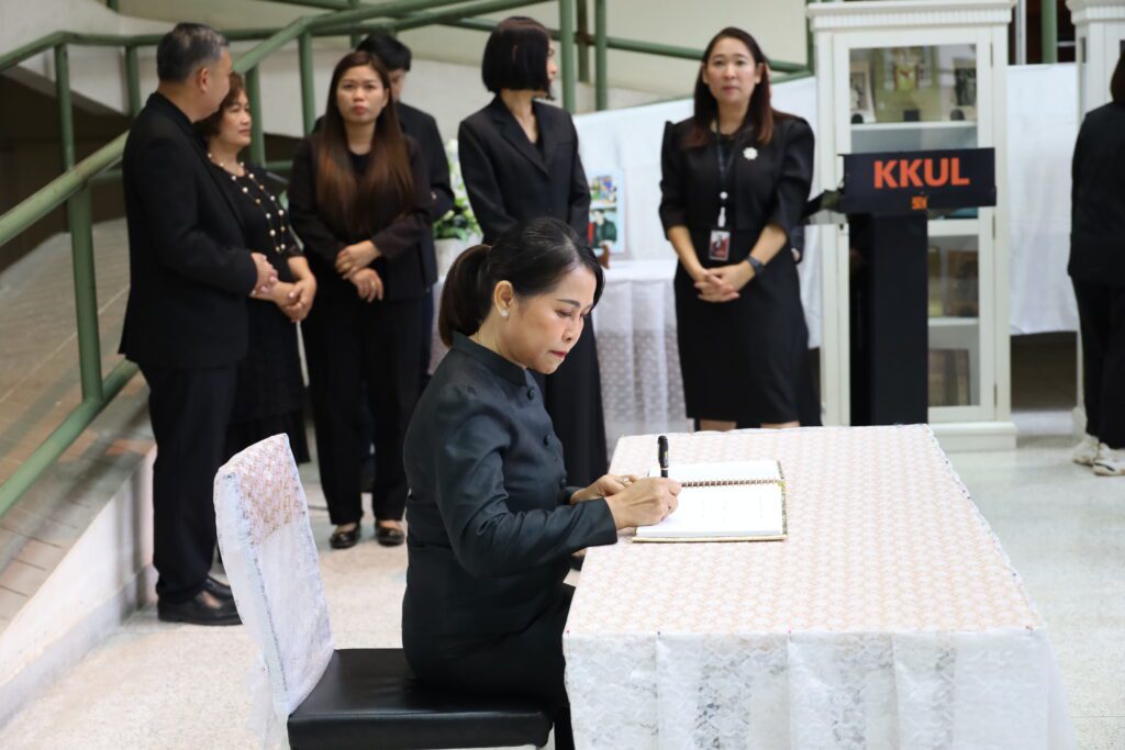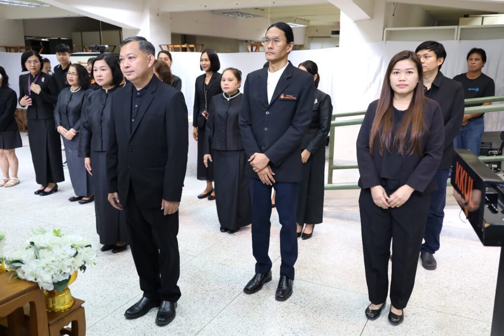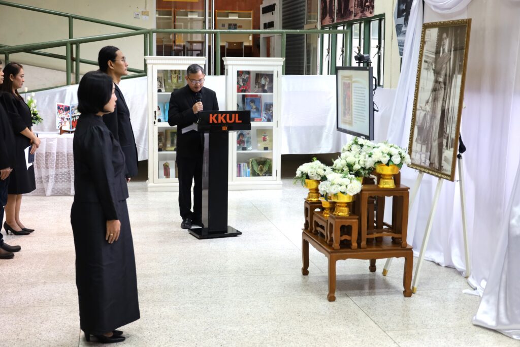 วันศุกร์ที่ 31 ตุลาคม 2568 เวลา 11.39 น. ณ หอจดหมายเหตุ สำนักหอสมุด มหาวิทยาลัยขอนแก่น ผู้บริหาร และ บุคลากรจากทุกหน่วยงานของ สำนักหอสมุด มข. ได้น้อมเกล้าน้อมกระหม่อมประกอบพิธีถวายความอาลัยแด่ สมเด็จพระนางเจ้าสิริกิติ์ พระบรมราชินีนาถ พระบรมราชชนนีพันปีหลวง โดยมี รศ.นพ.สุพัชญ์ สีนะวัฒน์ ผู้อำนวยการสำนักหอสมุด ประธานในพิธี นำกล่าวคำถวายความอาลัย หน้าพระฉายาลักษณ์ พร้อมด้วยผู้บริหาร และบุคคลากรเข้าร่วมพิธี และ ลงนามถวายความอาลัยและน้อมรำลึกในพระมหากรุณาธิคุณ ที่ทรงปฏิบัติพระราชกรณียกิจนานัปการ เพื่อประโยชน์สุขของพสกนิกรชาวไทย อีกทั้งทรงพระราชทานพระเมตตาเสด็จประกอบพระราชกรณียกิจอันเกี่ยวเนื่องกับมหาวิทยาลัยขอนแก่น เป็นระยะเวลายาวนานหลายทศวรรษ นับเป็นพระมหากรุณาธิคุณล้นเกล้าล้นกระหม่อมอย่างหาที่สุดมิได้