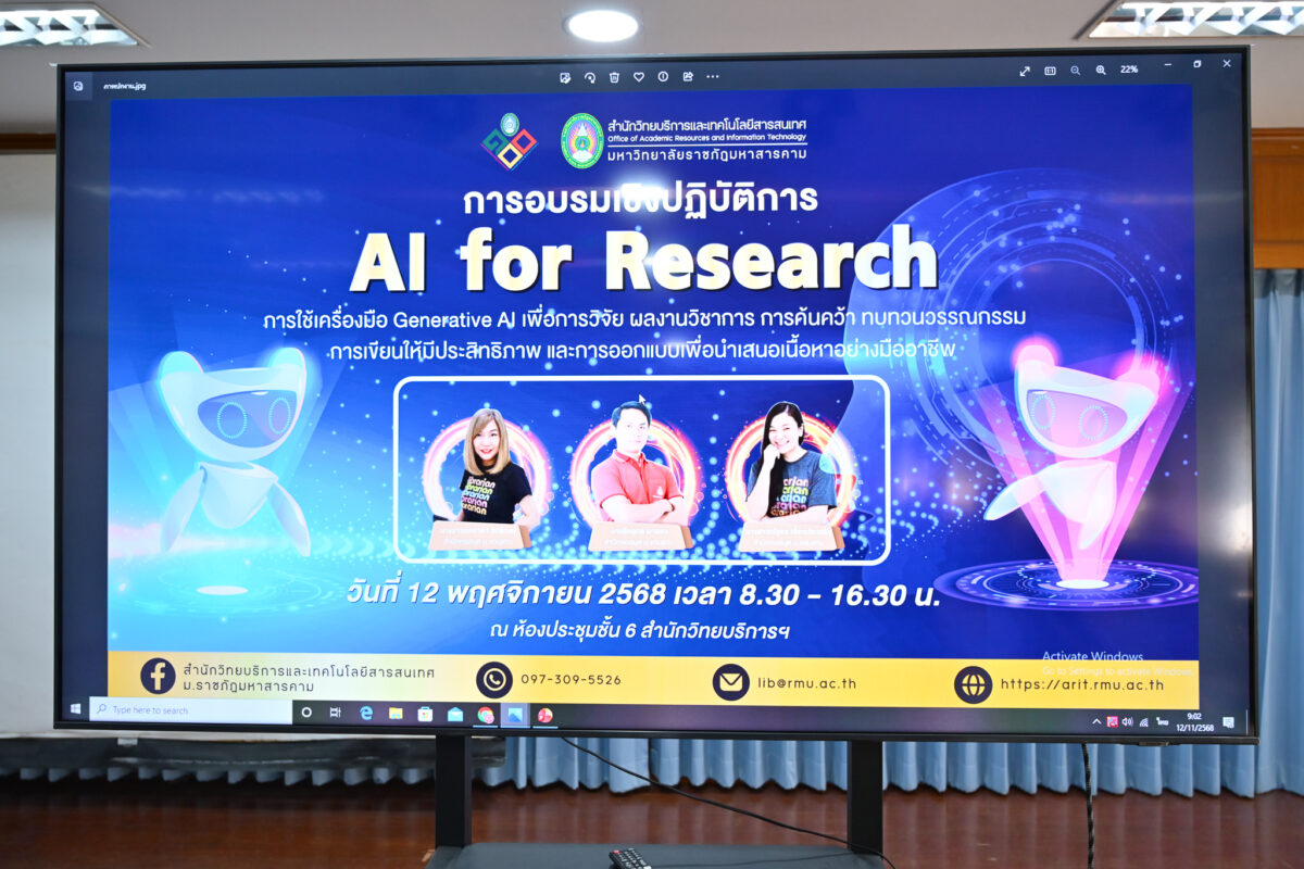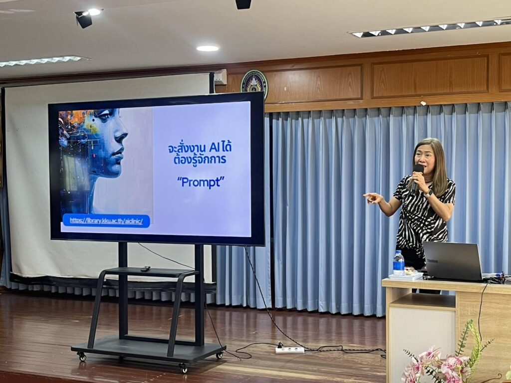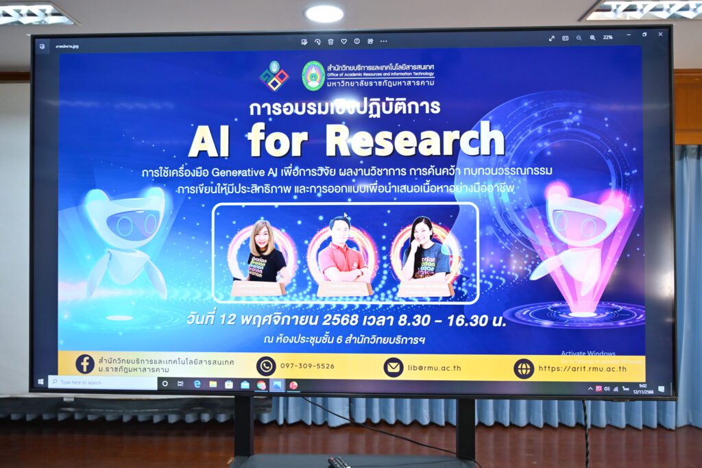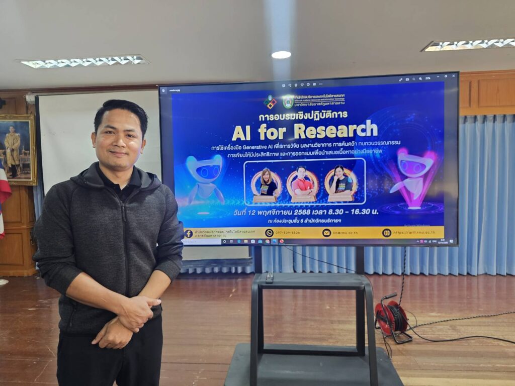 สำนักหอสมุด มหาวิทยาลัยขอนแก่น แสดงศักยภาพความเป็นเลิศทางวิชาการ ส่งทีมบุคลากรผู้เชี่ยวชาญร่วมเป็นวิทยากรในโครงการอบรมเชิงปฏิบัติการ “การใช้ AI สำหรับงานวิจัย (AI for Research)” จัดโดยสำนักวิทยบริการและเทคโนโลยีสารสนเทศ มหาวิทยาลัยราชภัฏมหาสารคาม เพื่อส่งเสริมและพัฒนาทักษะการใช้เทคโนโลยีปัญญาประดิษฐ์ในการยกระดับประสิทธิภาพงานวิจัยให้แก่อาจารย์และบุคลากร