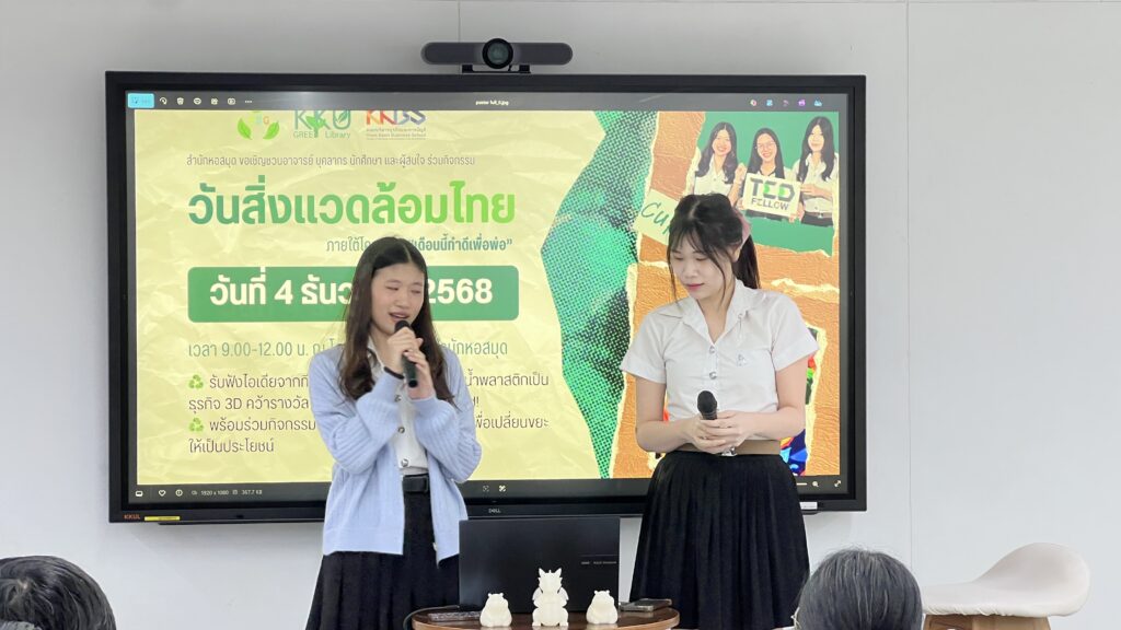 เมื่อวันที่ 4 ธันวาคม 2568 ณ ห้องโถงอาคาร 1 สำนักหอสมุด มหาวิทยาลัยขอนแก่น ได้จัดกิจกรรมเนื่องในวันสิ่งแวดล้อมไทย ประจำปี 2568 เพื่อส่งเสริมวัฒนธรรมองค์กรสีเขียวและปลูกฝังจิตสำนึกรักษ์สิ่งแวดล้อม โดยกิจกรรมในครั้งนี้ได้รับความร่วมมืออย่างดียิ่งจากหน่วยงานภายในมหาวิทยาลัยขอนแก่นซึ่งเป็นเครือข่ายห้องสมุดสีเขียว รวม 14 หน่วยงาน ได้แก่ คณะเศรษฐศาสตร์, คณะทันตแพทยศาสตร์, คณะพยาบาลศาสตร์, คณะบริหารธุรกิจและการบัญชี, วิทยาลัยการปกครองท้องถิ่น, วิทยาลัยนานาชาติ, บัณฑิตวิทยาลัย, ศูนย์นวัตกรรมการเรียนการสอน, KKU Academy, กองบริหารงานกลาง, กองสาธารณูปโภคและสิ่งแวดล้อม, กองป้องกันและรักษาความปลอดภัย, กองพัฒนานักศึกษาและศิษย์เก่าสัมพันธ์ และศูนย์บริหารจัดการทรัพย์สิน