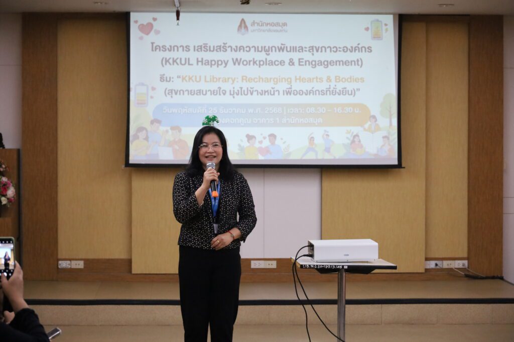 สำนักหอสมุด มหาวิทยาลัยขอนแก่น ให้ความสำคัญกับการพัฒนาคุณภาพชีวิตและสุขภาวะของบุคลากร จัดโครงการเสริมสร้างความผูกพันและสุขภาวะองค์กร “KKU Library: Recharging Hearts & Bodies” เพื่อเติมพลังกายและใจ ส่งเสริมทัศนคติเชิงบวก และสร้างบรรยากาศการทำงานที่เปี่ยมด้วยความสุขและความสามัคคี