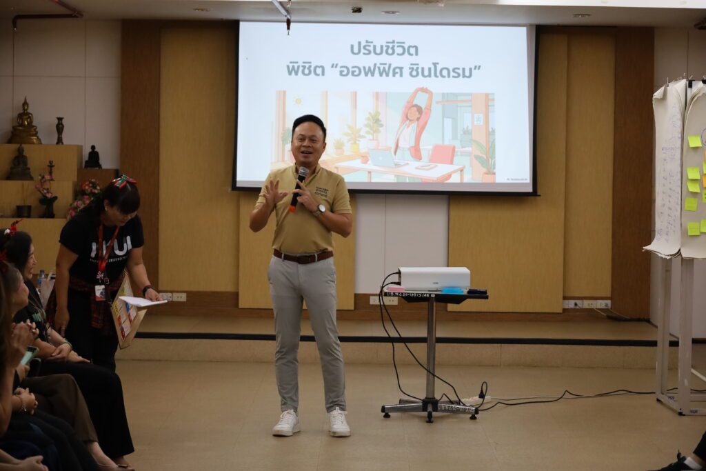- ช่วงบ่าย: การอบรมเชิงปฏิบัติการหัวข้อ “Library Fit & Firm: พิชิตออฟฟิศซินโดรม” ซึ่งให้ความรู้และฝึกปฏิบัติท่ากายบริหารอย่างง่ายสำหรับชาวออฟฟิศ เพื่อป้องกันและบรรเทาอาการออฟฟิศซินโดรม ส่งเสริมให้บุคลากรมีสุขภาพร่างกายที่แข็งแรงและพร้อมสำหรับการปฏิบัติงานอย่างเต็มประสิทธิภาพ วิทยากรโดย กภ.เฉลิมวุฒิ ศรีอ่อนหล้า
