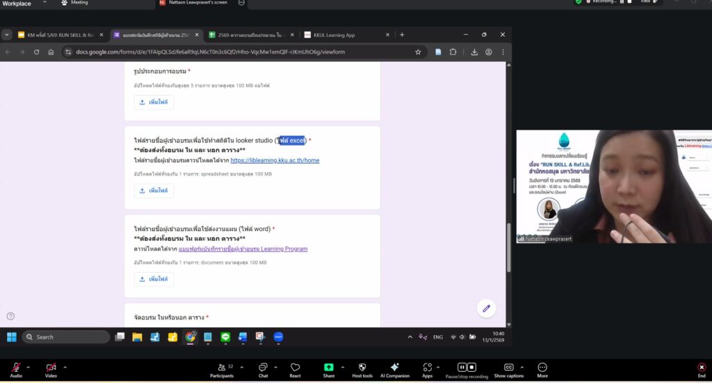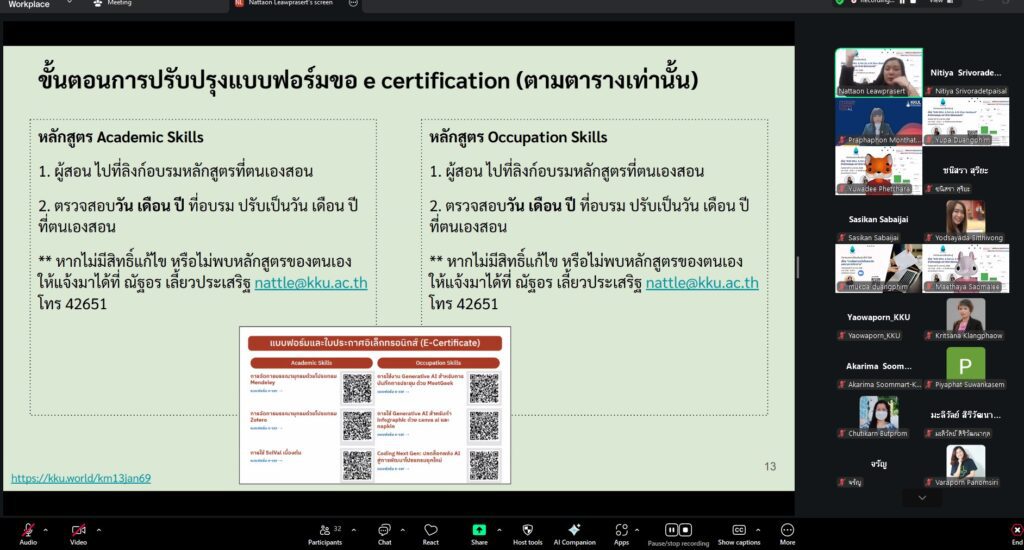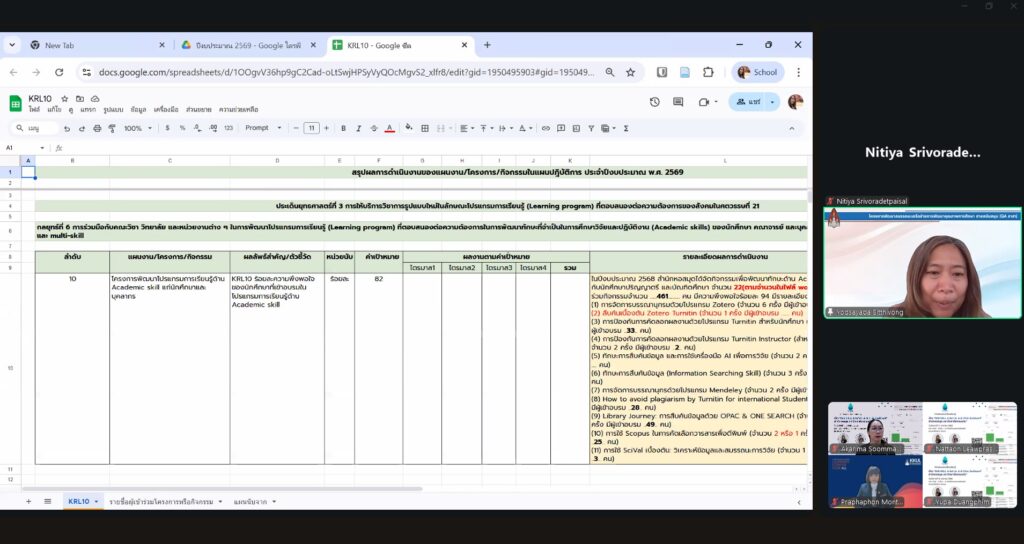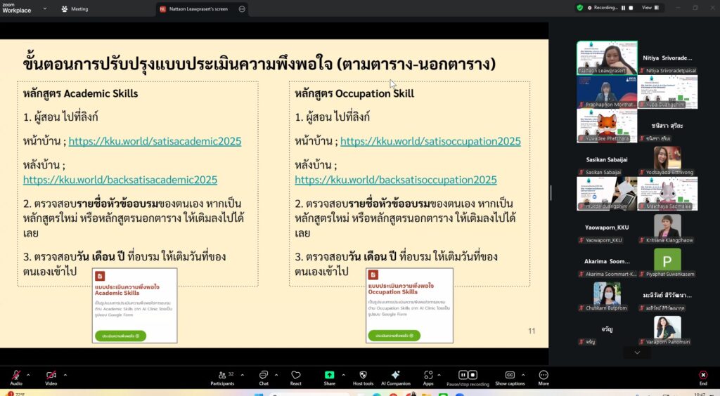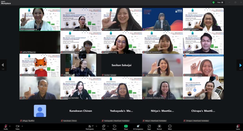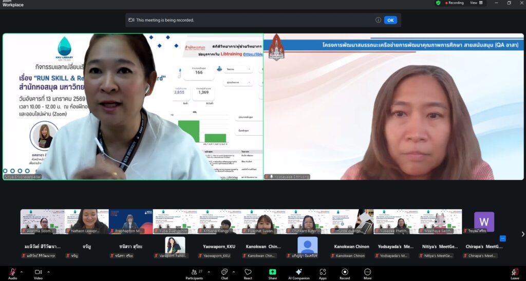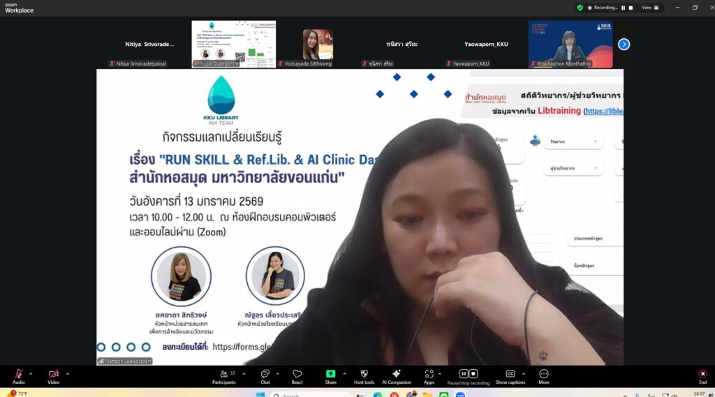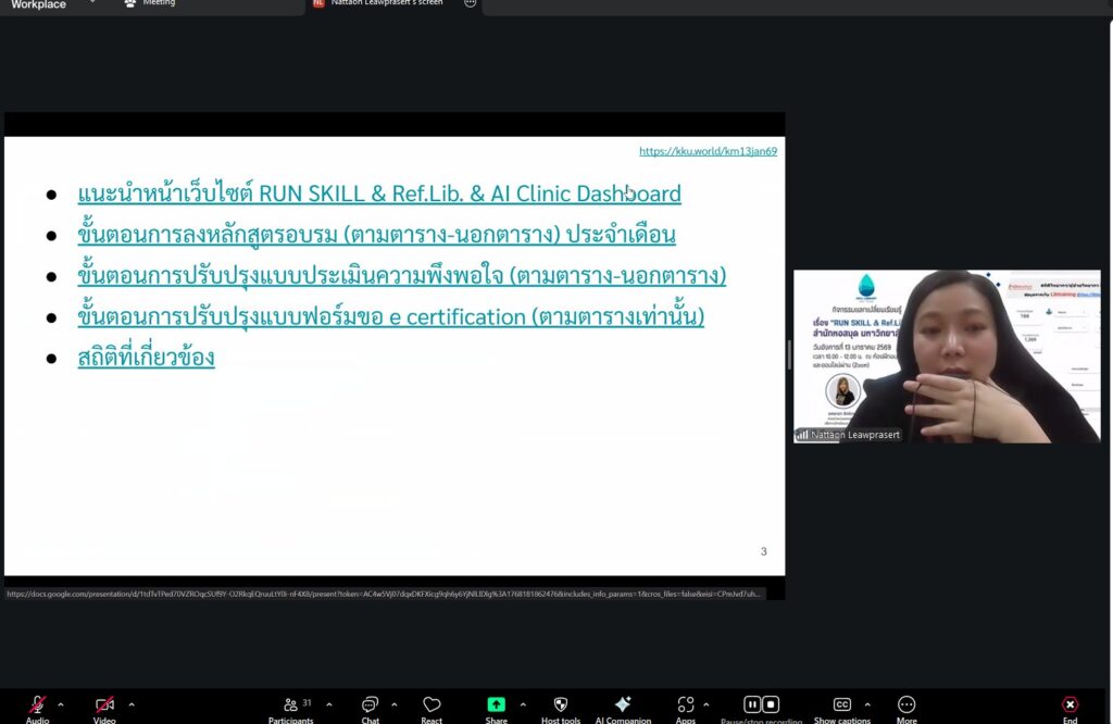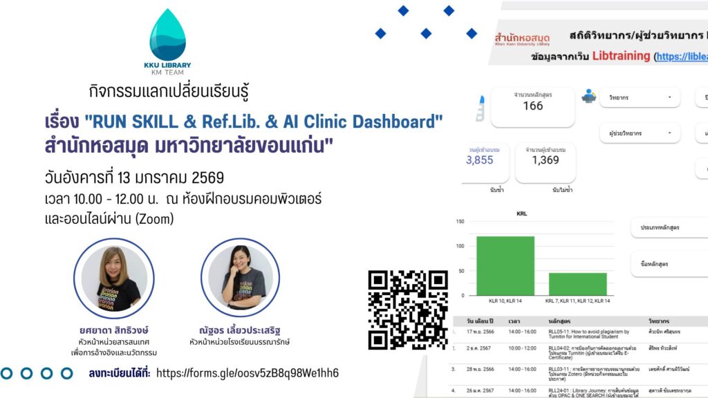 วันอังคารที่ 13 มกราคม 2569 เวลา 10.00 – 11.30 น. คณะกรรมการจัดการความรู้และนวัตกรรม จัดกิจกรรมแลกเปลี่ยนเรียนรู้ ครั้งที่ /69: “RUN SKILL & Ref.Lib. & AI Clinic Dashboard สำนักหอสมุด มหาวิทยาลัยขอนแก่น” ออนไลน์ผ่าน Zoom วิทยากร โดย นางสาวยศยาดา สิทธิวงษ์ หัวหน้าหน่วยสารสนเทศเพื่อการอ้างอิงและนวัตกรรม และนางสาวณัฐอร เลี้ยวประเสริฐ หัวหน้าหน่วยโรงเรียนบรรณารักษ์ มีผู้เข้าร่วมแลกเปลี่ยนเรียนรู้จำนวน 28 คน