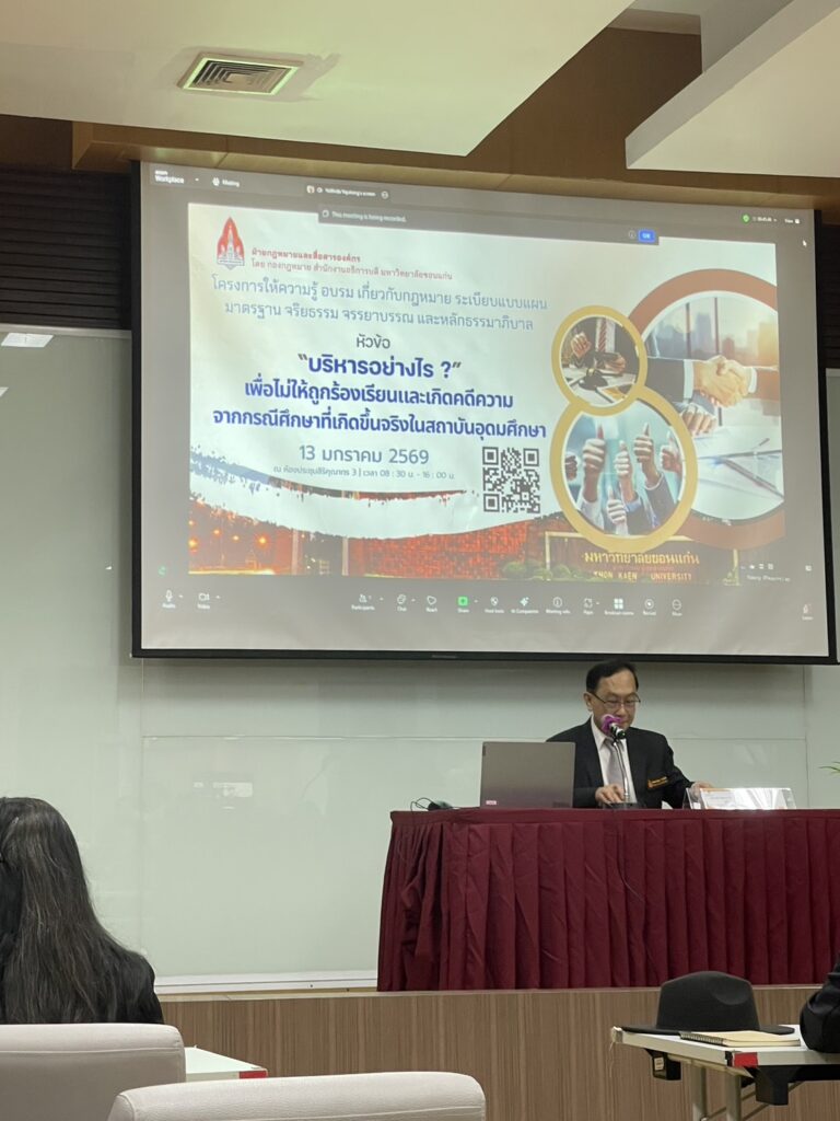 สำนักหอสมุด มหาวิทยาลัยขอนแก่น ส่งผู้บริหารเข้าร่วมโครงการให้ความรู้และอบรมเกี่ยวกับกฎหมาย หัวข้อ “บริหารอย่างไรเพื่อไม่ให้ถูกร้องเรียนและเกิดคดีความจากกรณีศึกษาที่เกิดขึ้นในสถาบันอุดมศึกษา” ซึ่งจัดโดยกองกฎหมาย สำนักงานอธิการบดี ณ ห้องสิริคุณากร 3 มหาวิทยาลัยขอนแก่น