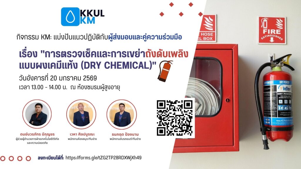 เมื่อวันที่ 20 มกราคม 2569 เวลา 13.00-14.00 น. ที่ผ่านมา สำนักหอสมุด มหาวิทยาลัยขอนแก่น ได้จัดกิจกรรมการจัดการความรู้ (Knowledge Management – KM) ภายใต้หัวข้อ “การตรวจเช็คและการเขย่าถังดับเพลิง แบบผงเคมีแห้ง (Dry Chemical)” ซึ่งเป็นส่วนหนึ่งของโครงการแบ่งปันแนวปฏิบัติที่ดีกับผู้ส่งมอบและคู่ความร่วมมือ ณ ห้องชมรมผู้สูงอายุ อาคารศูนย์สารสนเทศ มีผู้เข้าร่วมแลกเปลี่ยนเรียนรู้จำนวน 16 คน