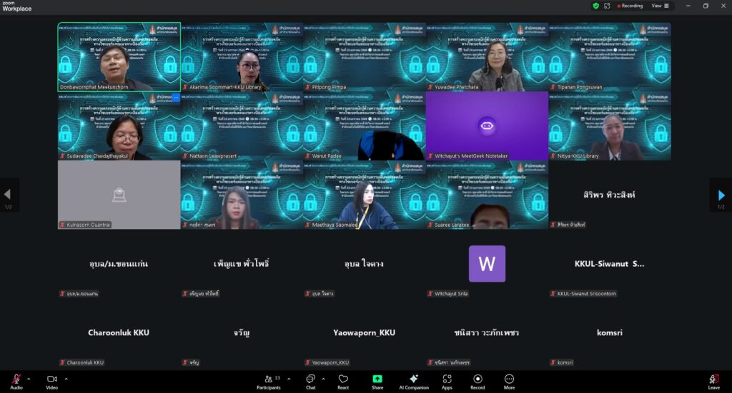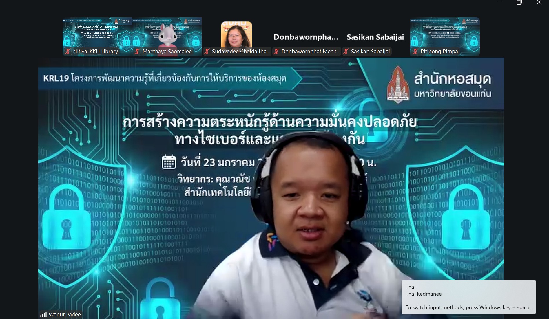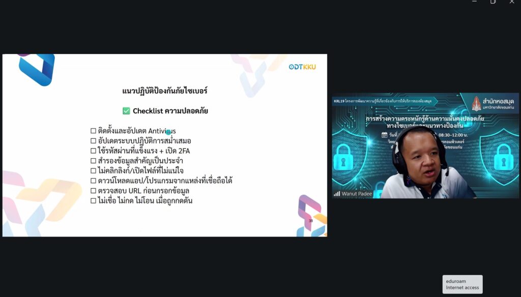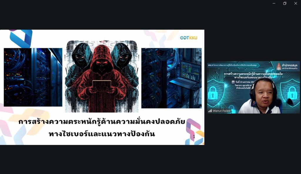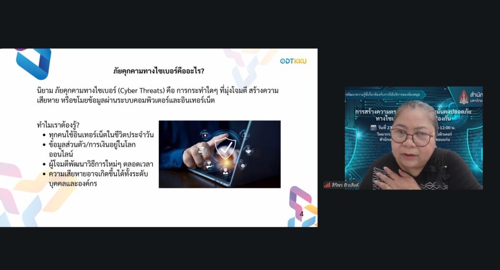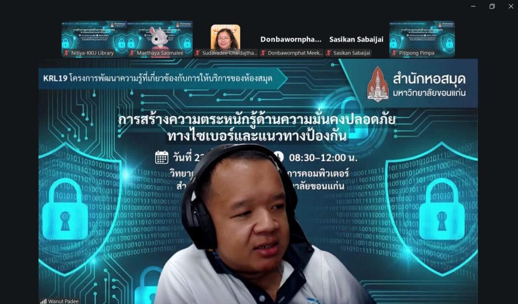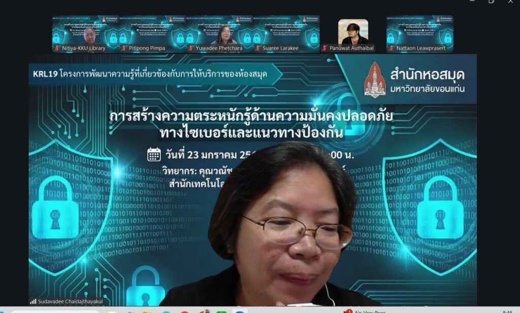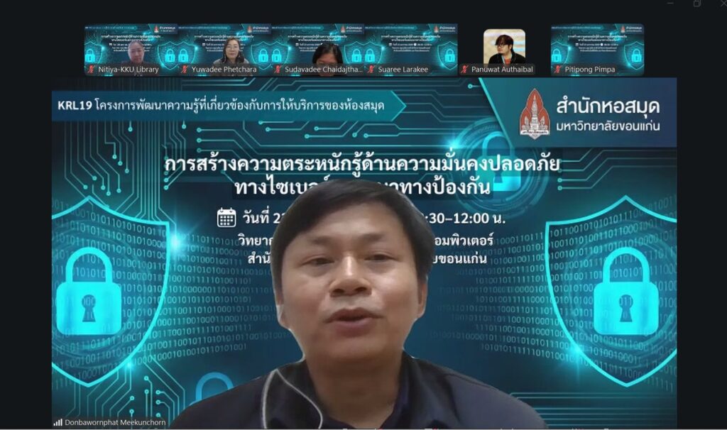 เรื่องการสร้างความตระหนักรู้ด้านความมั่นคงปลอดภัยทางไซเบอร์และแนวทางป้องกัน ออนไลน์ผ่าน Zoom วิทยากรโดย นายวณัช พาดี นักวิชาการคอมพิวเตอร์ สำนักเทคโนโลยีดิจิทัล มหาวิทยาลัยขอนแก่น เปิดการอบรมโดย นายดนย์บวรภัทร มีกุญชร ผู้ช่วยผู้อำนวยการฝ่ายเทคโนโลยีดิจิทัลและความปลอดภัย การอบรมในครั้งนี้มีวัตถุประสงค์เพื่อพัฒนาความรู้ด้านความปลอดภัยทางไซเบอร์ให้แก่บุคลากรสำนักหอสมุดอย่างต่อเนื่อง และสนับสนุนเป้าหมายตามแผนปฏิบัติการประจำปี 2569