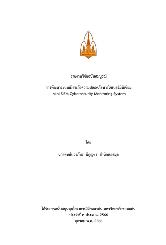 รายงานวิจัยฉบับสมบูรณ์ การพัฒนาระบบเฝ้าระวังความปลอดภัยทางไซเบอร์มินิเซียม 29 January 2026 by nitiya srivoradetpisal สำนักหอสมุด_ดนย์บวรภัทร_4.1.2 (1)Download โปรดให้คะแนนเรื่องนี้ Views: 20
