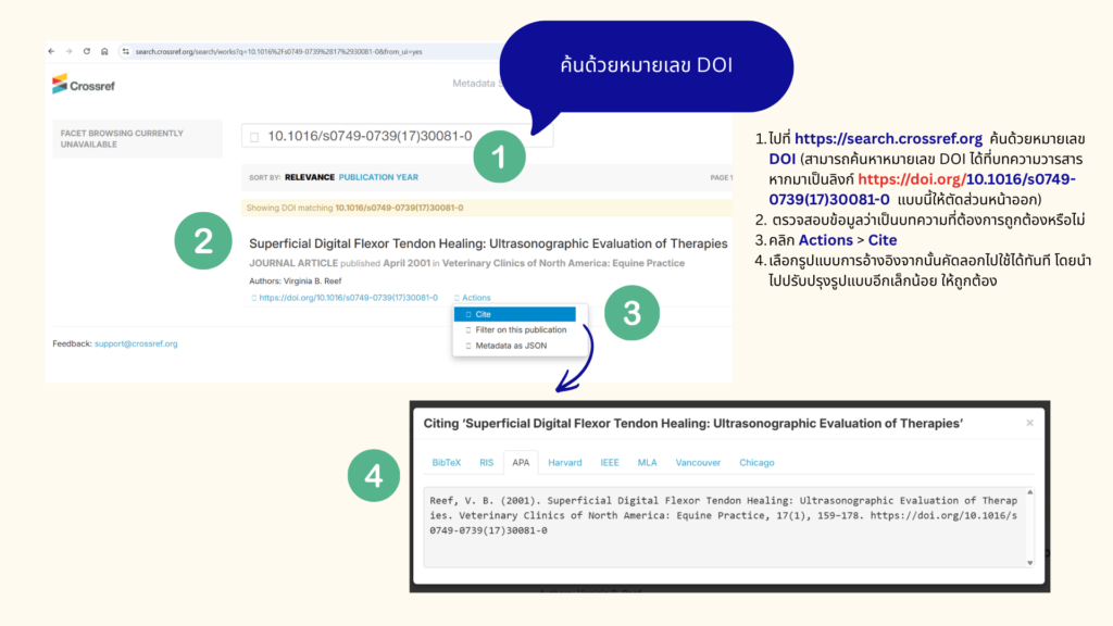 – หากต้องการเขียนอ้างอิงท้ายเอกสารที่เป็นบทความวารสารภาษาอังกฤษที่มี DOI สามารถไปที่ https://search.crossref.org/ ใส่คำค้นเป็นหมายเลข DOI > Actions > Cite > APA (หรือรูปแบบอื่น ๆ ที่ต้องการ) แล้วคัดลอกนำไปใช้งานได้เลยหรือปรับปรุงเล็กน้อยก่อนนำไปใช้งาน ก็เป็นอีกวิธีที่ช่วยประหยัดเวลาในการเขียนเองตามคู่มือ
