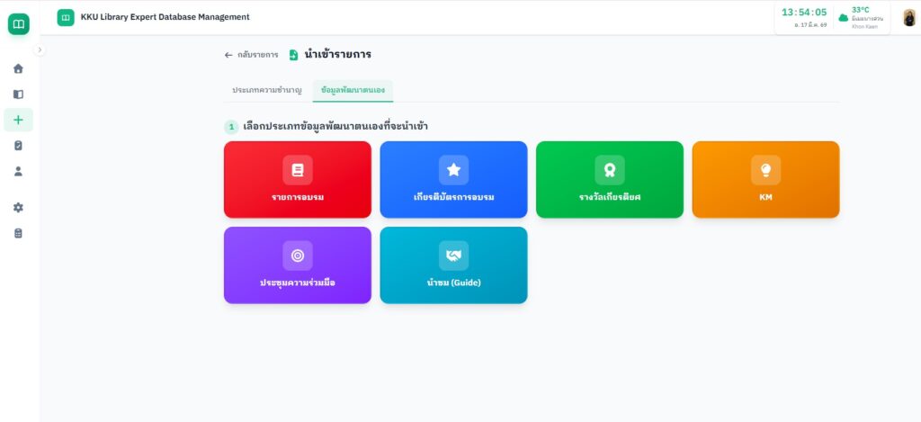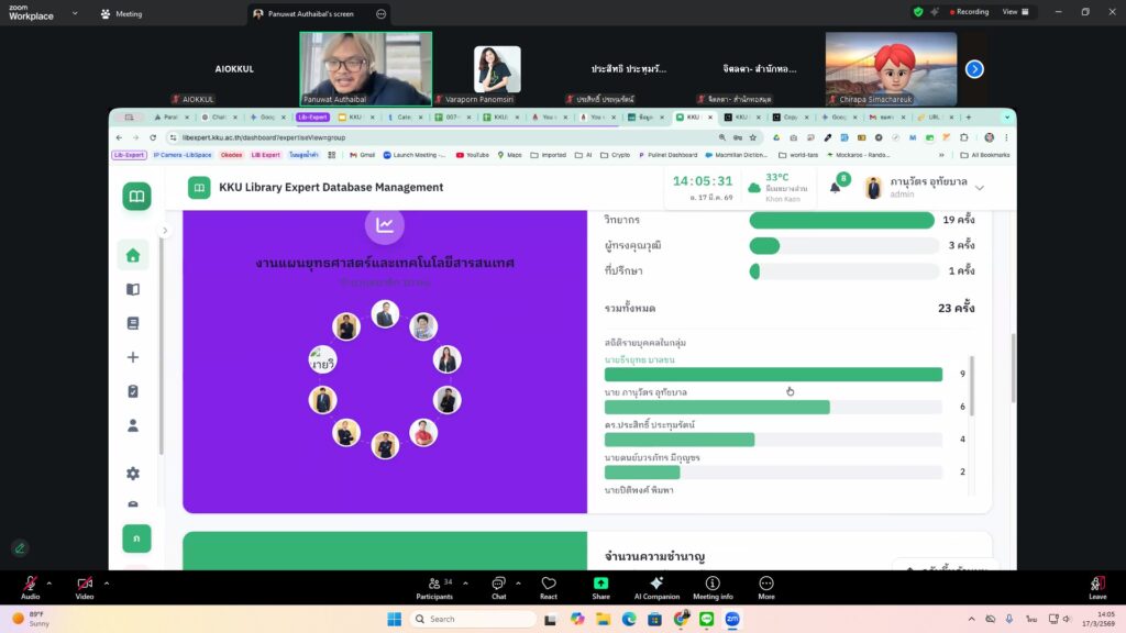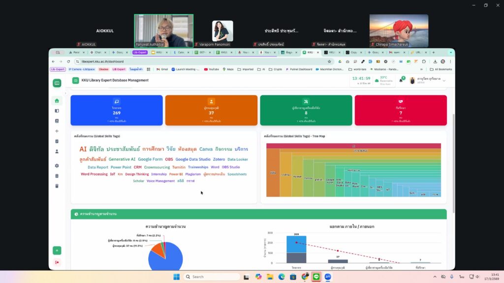 วันอังคารที่ 17 มีนาคม 2569 เวลา 13.30 – 15.30 น. คณะกรรมการจัดการความรู้และนวัตกรรม จัดกิจกรรมแลกเปลี่ยนเรียนรู้ ครั้งที่ 9/69: “คลังข้อมูลดิจิทัลเพื่อจัดเก็บผลงานและความเชี่ยวชาญ (KKU Library Expert Database Management)” วิทยากรโดย นายภานุวัตร อุทัยบาล นักเอกสารสนเทศชำนาญการ ณ ห้องฝึกอบรมคอมพิวเตอร์ และออนไลน์ผ่าน Zoom มีผู้สนใจเข้าร่วมจำนวน 33 คน