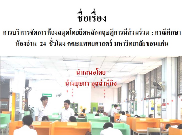 การบริหารจัดการห้องสมุดโดยยึดทฤษฎีการมีส่วนร่วม: กรณีศึกษาห้องอ่าน 24 ชั่วโมง คณะแพทยศาสตร์ มหาวิทยาลัยขอนแก่น 17 April 2025 by นักศึกษาฝึกงาน